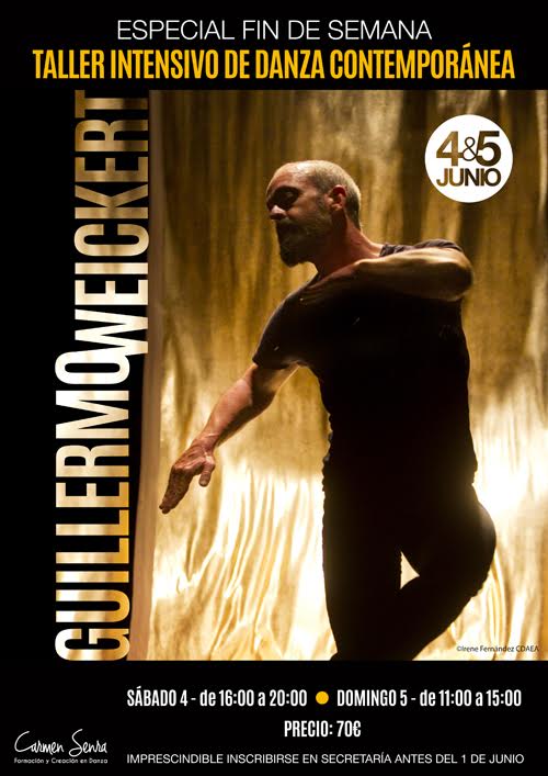 Guillermo Weickert es uno de los coreógrafos más interesantes del panorama de la danza contemporánea actual. Sus trabajos aúnan riesgo físico, gran sensibilidad y, sobre todo, mucha honestidad. Los próximos 4 y 5 de Junio te invitamos a que vengas a la escuela a hacer un taller intensivo con este artista que estamos seguros de que sabrá ayudaros a sacar lo mejor de cada uno de vosotros. Si quieres más información llama a la secretaría de la escuela.